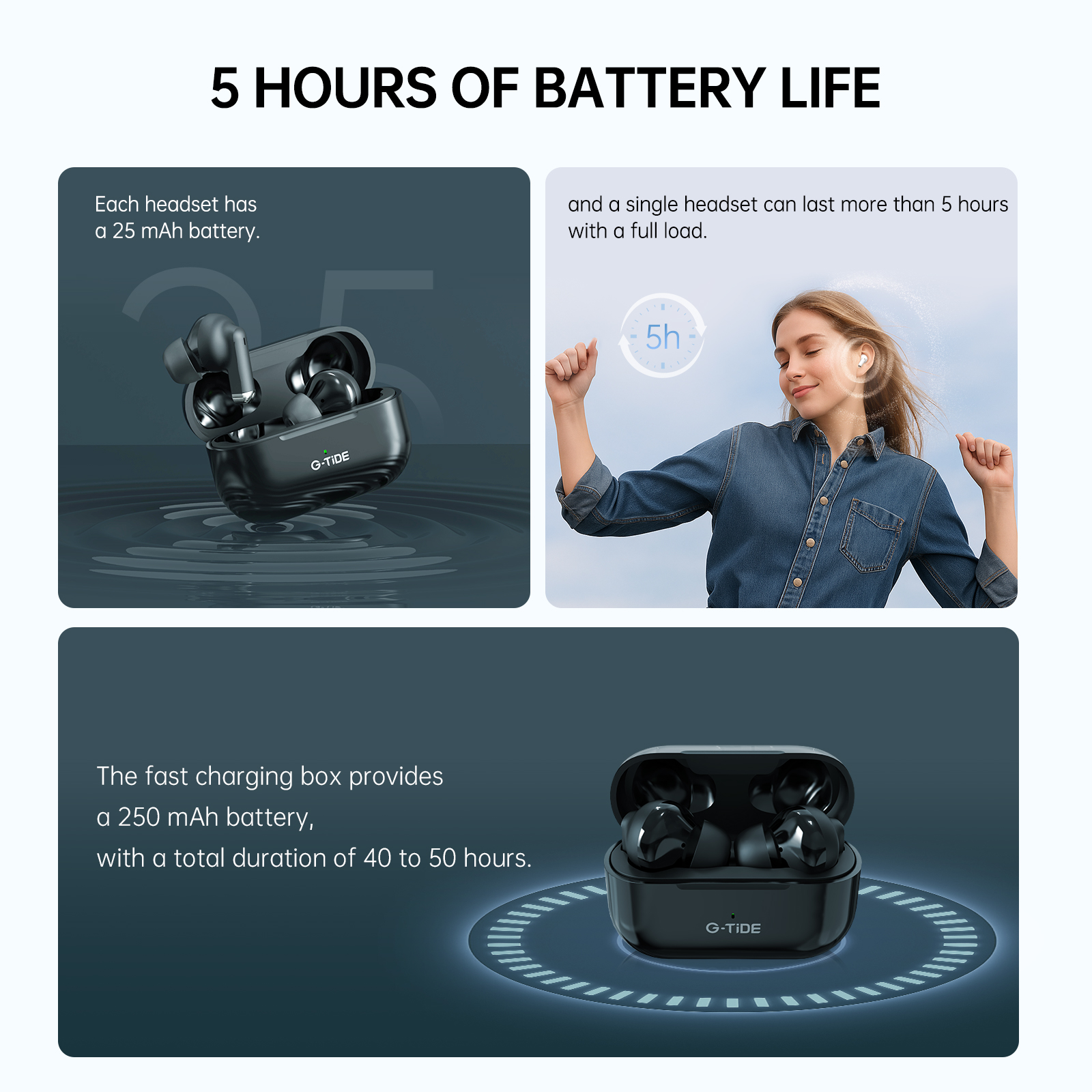 The 300mAh battery offers 90 days of battery life, 5 ~ 6 hours of continuous music playback, and supports automatic reconnection at a distance of 20 meters.